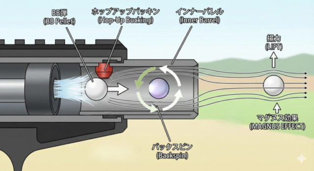 BB弾がバックスピンしながら空気中を進むと、弾の上側の空気の流れが速くなり、下側の流れが遅くなります。その結果、気圧の差が生まれて上向きの力(揚力)が発生します。