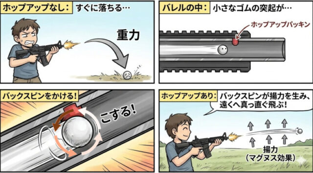 ホップアップとは、一言で言えば「BB弾にバックスピン(後ろ向きの回転)をかける仕組み」のことです。