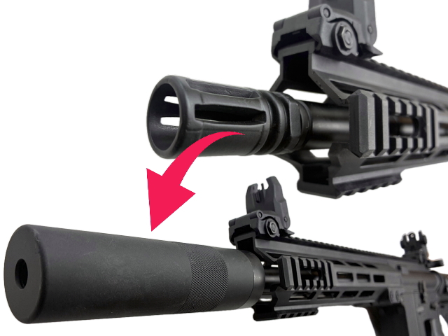 フラッシュハイダーのイモネジを緩めて取り外すと、14mm逆ネジ仕様になっているので、対応のサプレッサー等が装着可能です。