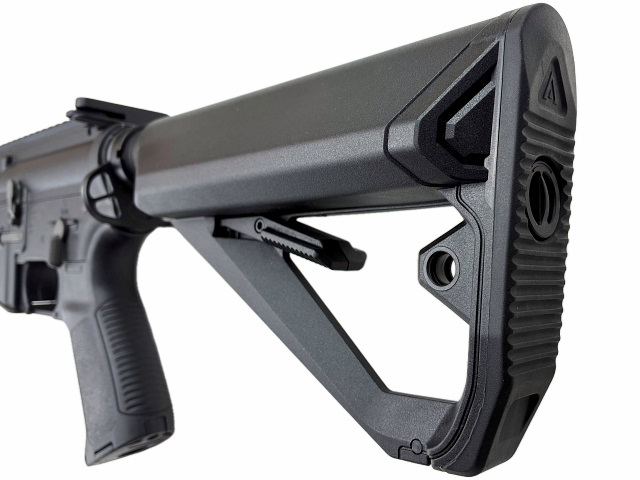 オリジナル・デザインのストックは、クレーン・ストックの様な頬付けし易い幅広な形状と、十分なバッテリー・スペースが特徴。