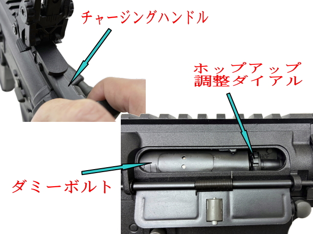 チャージング・ハンドルをいっぱいに引くと、エジェクションポート・カバーとダミーボルトが開いて、ダミーボルトがホールドオープンします。