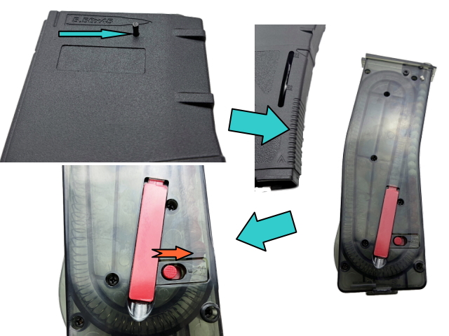 装弾数30/130発の切替は、固定ピンとマガジン・ベースを外し、カバーから内部を取り出して、切替レバーを右にスライドさせると装弾数30発になります。