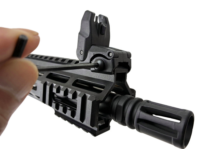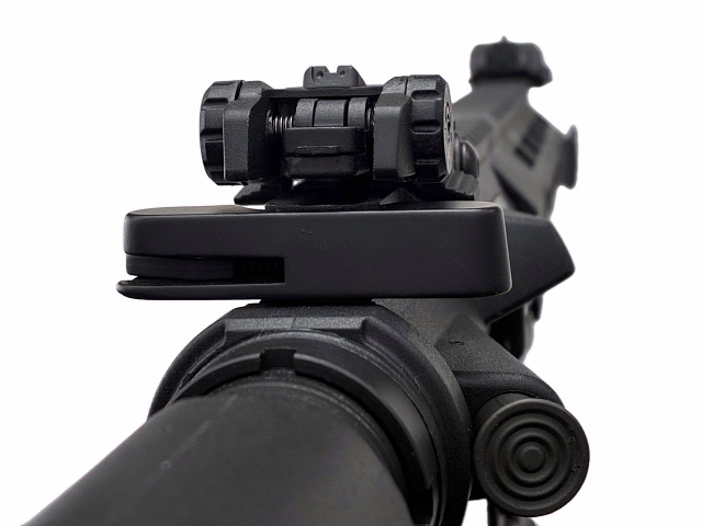 リアサイトのビープホールの穴は二重になっていて、前側を倒す事で穴が大きくなり、精密射撃用から近接戦闘用にする事が出来ます。