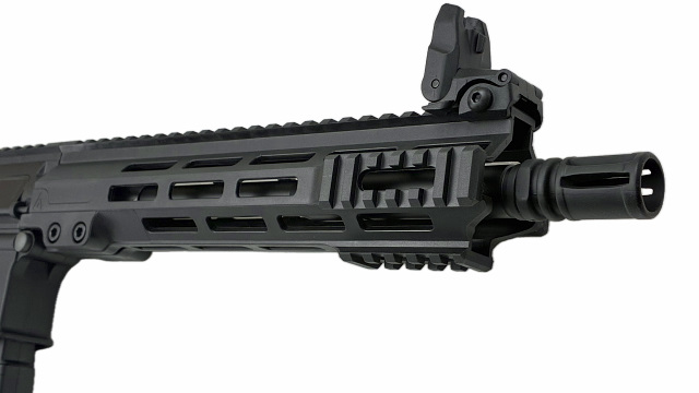 ハンドガードはM-LOK仕様のガイズリータイプなのですが、先端部分は4面レイルになっています。
