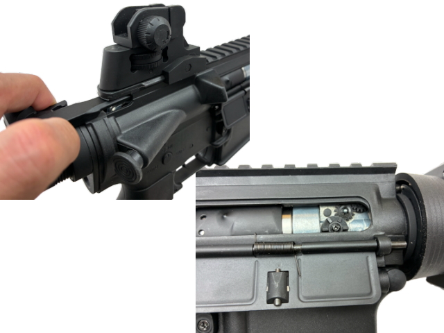 チャージングを引くとエジェクション・ポート内のダミーボルト・カバーが開いて、ホップアップ調整ダイアルが見えます。