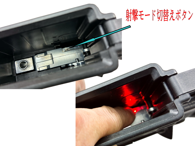 マガジン・ハウジングの奥にある切替えボタンを長押しすると赤く点灯し、2~3秒後に点滅に変わってモードが切替わります。