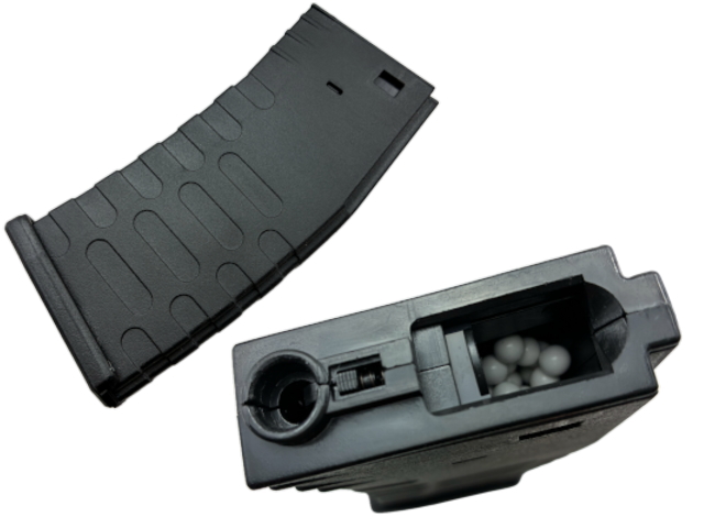 上部のフタを開けてBB弾を流し込み、マガジン底部のゼンマイ・ギアを巻き上げて使用します。