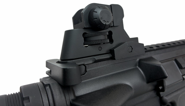リアサイトはLMTタクティカルサイトで、上下左右の調整が出来るフルアジャスタブル・タイプ。
