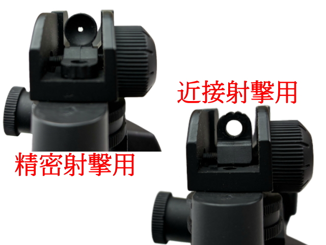 リアサイトのビープホールはシーソー式で、近接射撃用と精密射撃用を切り替える事が出来ます。